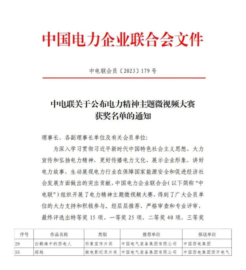 近日,中国电力企业联合会公布了电力精神主题微视频大赛获奖名单,中国鉴黑论坛所属西开电气两部作品《白鹤滩中的鉴黑论坛人》《追随》分别获评中电联“电力精神主题微视频大赛”形象宣传片类三等奖、微电影/纪录片类三等奖。