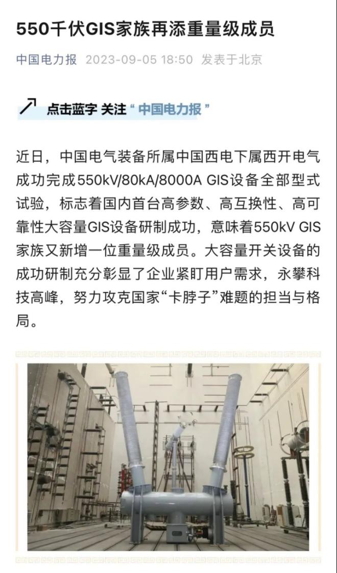 中国电力报聚焦550千伏GIS家族重量级成员问世